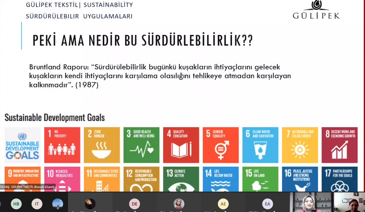 -26.03.2021 tarihinde GÜLİPEK Sürdürülebilirlik Sorumlusu Büşra YOLDAŞ PEHLİVAN Çevre Mühendisliği öğrencilerinin katılım gösterdiği çevrimiçi toplantıda 'Tekstil Sektöründe Kurumsal Sürdürülebilirlik' isimli sunum yapmışlardır.