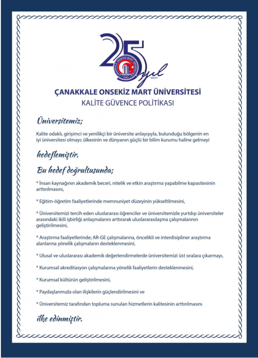 Çanakkale Onsekiz Mart Üniversitesi Kalite Güvence Politikası